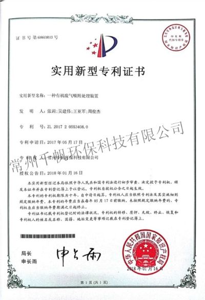 實用新型專利證書 一種用于處理含塵有機廢氣的一體化裝置